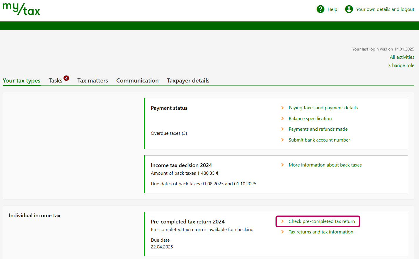 Go to the Individual income tax section, select Tax card and prepayment 2025 and click the Tax returns and tax information link.