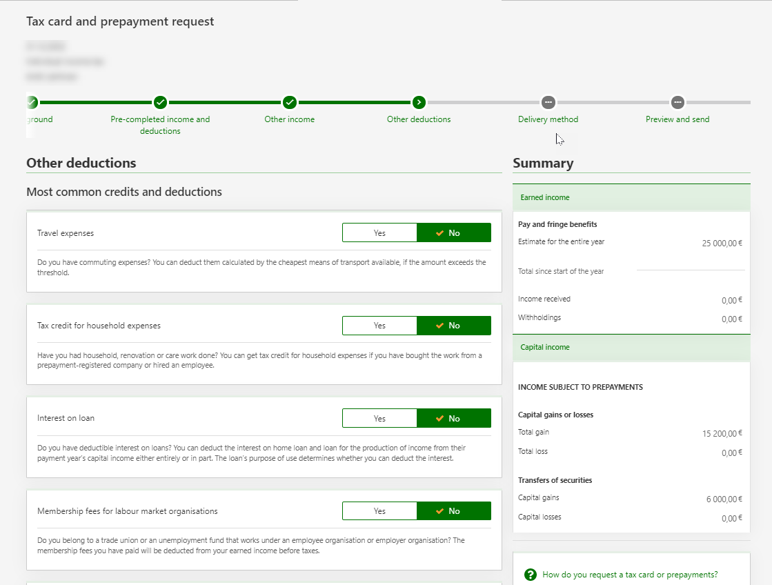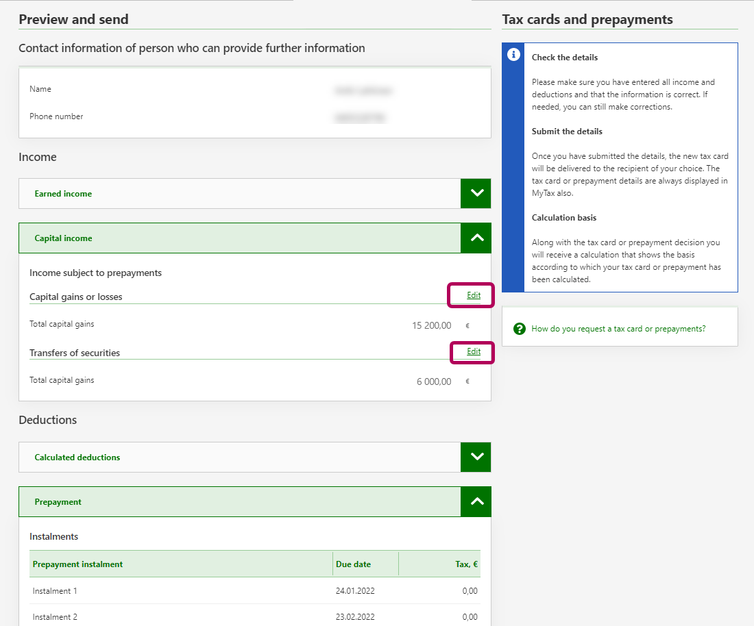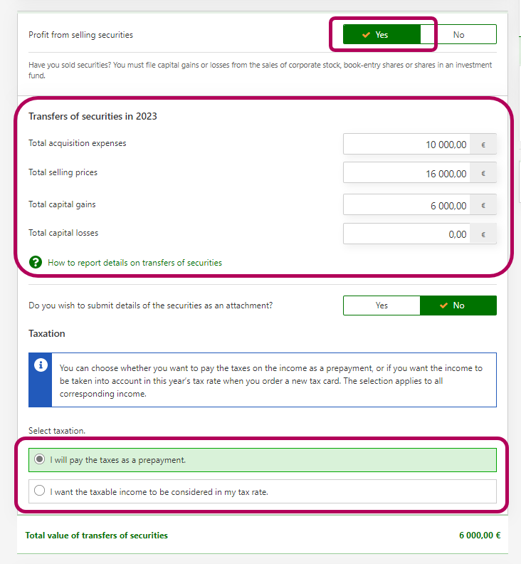 When you inform the Tax Administration of these transactions while the current year is still ongoing, you can also submit an application for a revised tax card or request a calculation for tax prepayment. This means that you can pre-pay the taxes that will later be assessed on the capital gains you receive from the sale. You can do so by making a prepayment or by raising the withholding rate on your tax card for wage income.