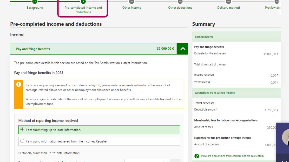 This stage also shows the amounts of your other income and deductions. Check them and make corrections if necessary.