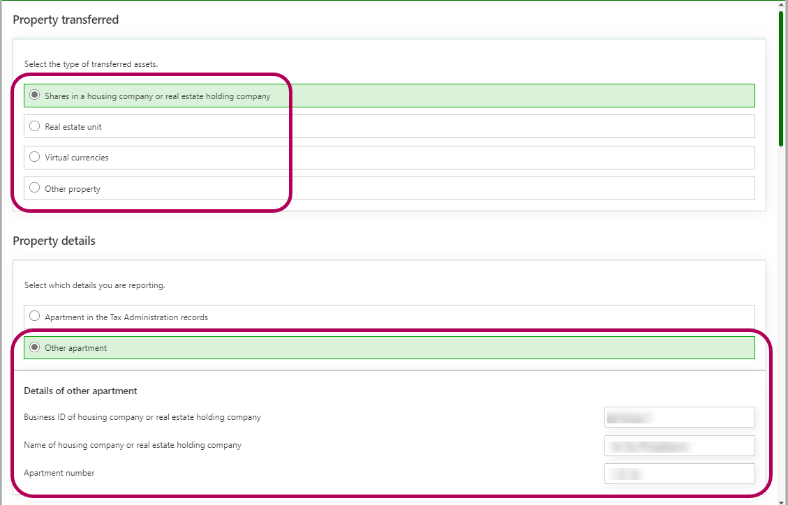If you sold property other than the home where you had lived and you received a capital gain which is exempted from tax, answer Yes to “Are you reporting other tax-exempt capital gains?”. Examples of partially and fully tax-exempt gains: you sell property in circumstances linked to a transfer of a farm/company to the next generation; you sell a forest to the State of Finland so it will be converted into an area of national nature conservation.