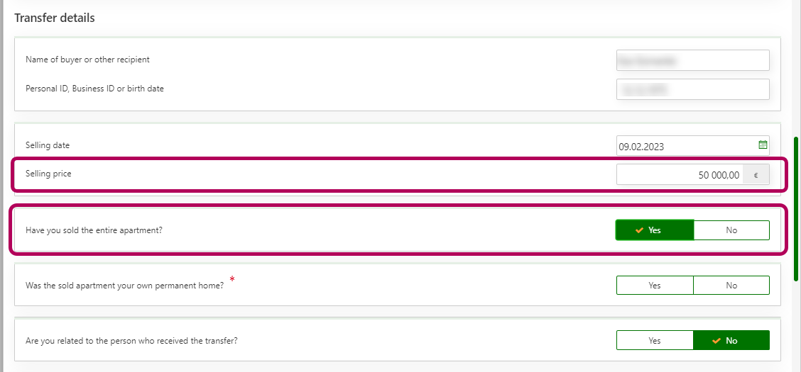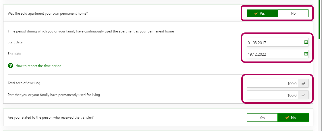 - fill in Yes in answer to “Was the transferred apartment your own permanent home?”,