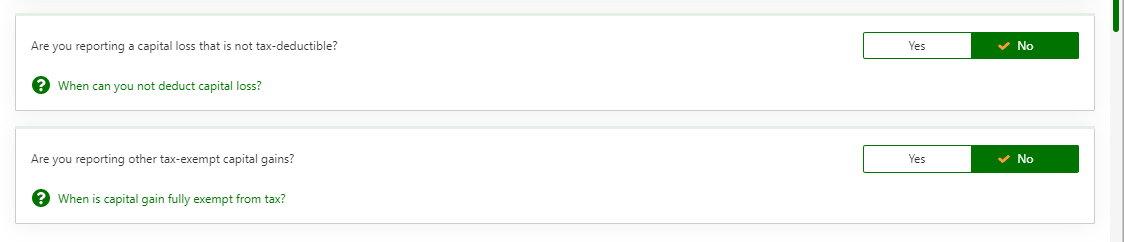 3. The Pre-completed income and deductions stage: If any other capital gains or capital losses have been reported previously, you can see your previous entries here. This is the stage where you should also enter the new sales or other transfers and dispositions of property.