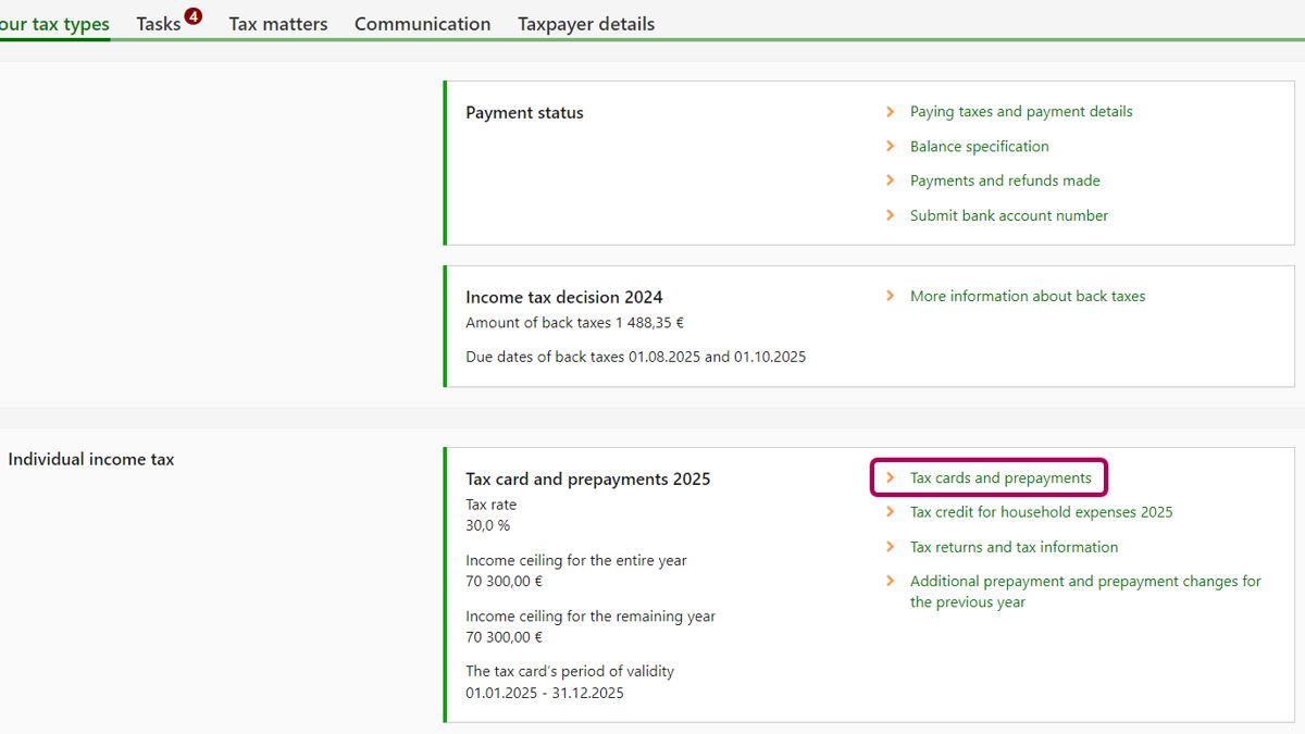 1. Go to the Individual income tax section, select Tax card and prepayments 2025 and click Tax cards and prepayments. Scroll down to Prepayments.