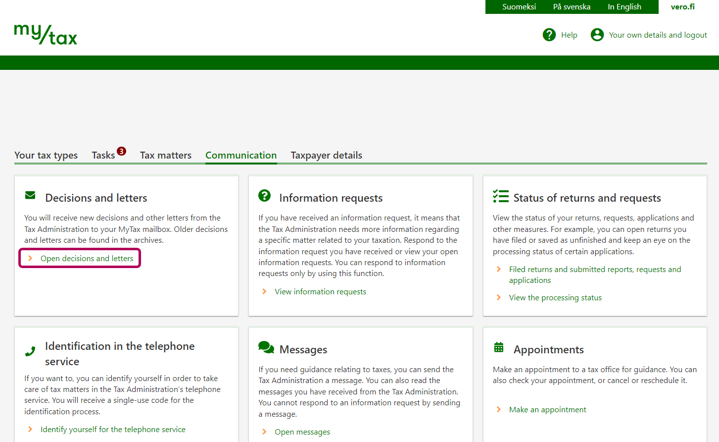 When the certificate is ready, you can open it through the details on the transfer tax or in the MyTax mailbox. If Your tax types tab does not show transfer tax, please log in to MyTax again. If you have filed your transfer tax return on paper, wait for the certificate of transfer tax to become available in MyTax.