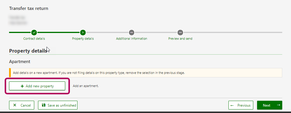- A new window opens. Enter details on the property you have bought. Scroll down to see more fields to fill in. If you have purchased the property together with someone else, only enter the part of the price and other compensation that you have paid. Each buyer must file their own transfer tax returns.