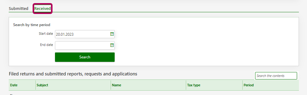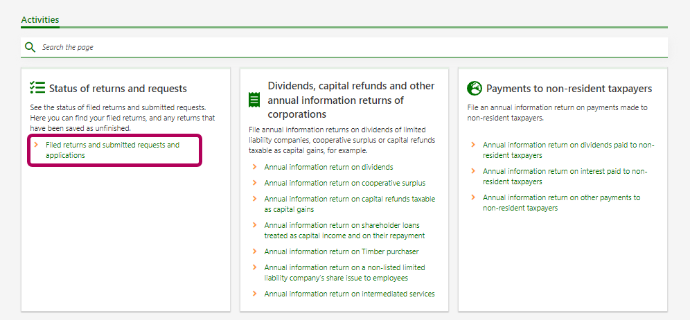 On the home page, go to Status of returns, requests and applications, and select Filed returns and submitted requests and applications.