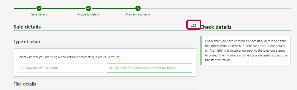 Recheck the details on the transfer tax return. If necessary, you can make further changes by clicking Edit. When everything is correct, click Submit.