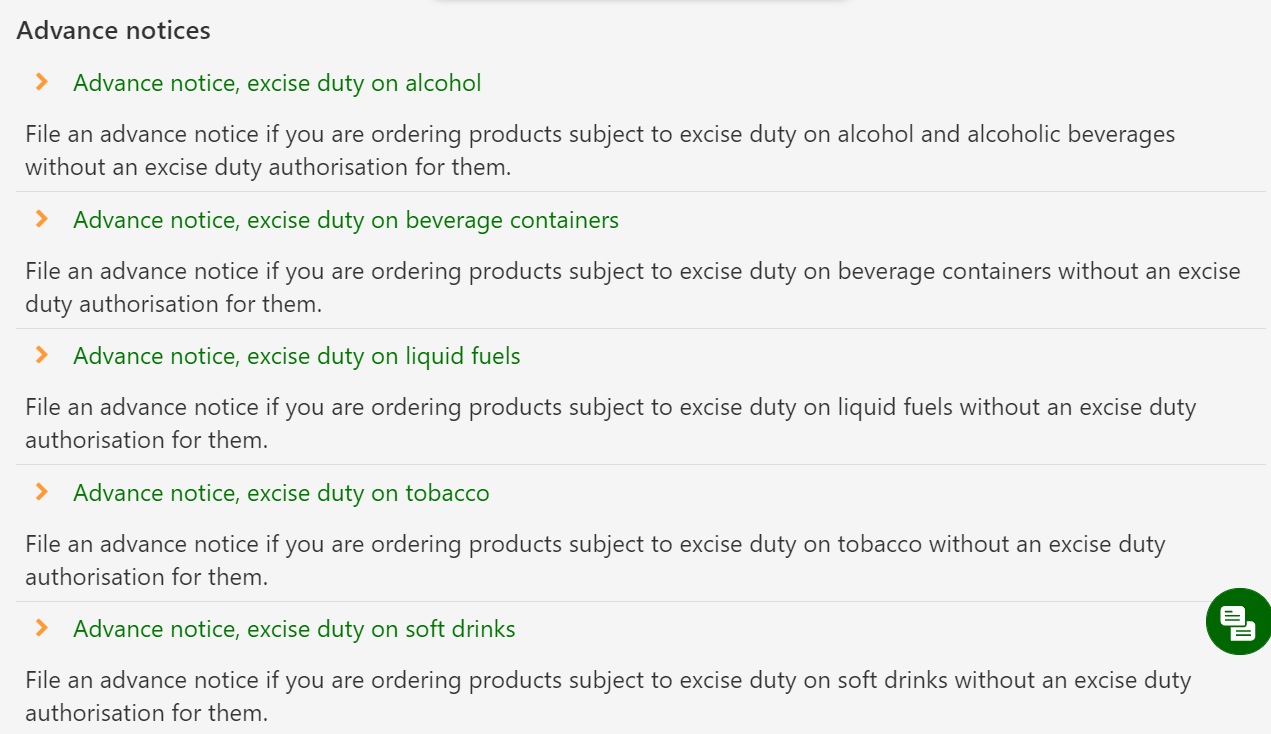 In most cases, MyTax calculates the guarantee amount automatically. If you file the advance notice on paper, calculate the amount required as the guarantee and enter the sum on the paper form in euros. The amount of the guarantee is equal to the amount of the excise duty that is to be paid on the product. You can check the duty amounts in the tax rate tables for excise duties (available in Finnish and Swedish, link to Finnish).