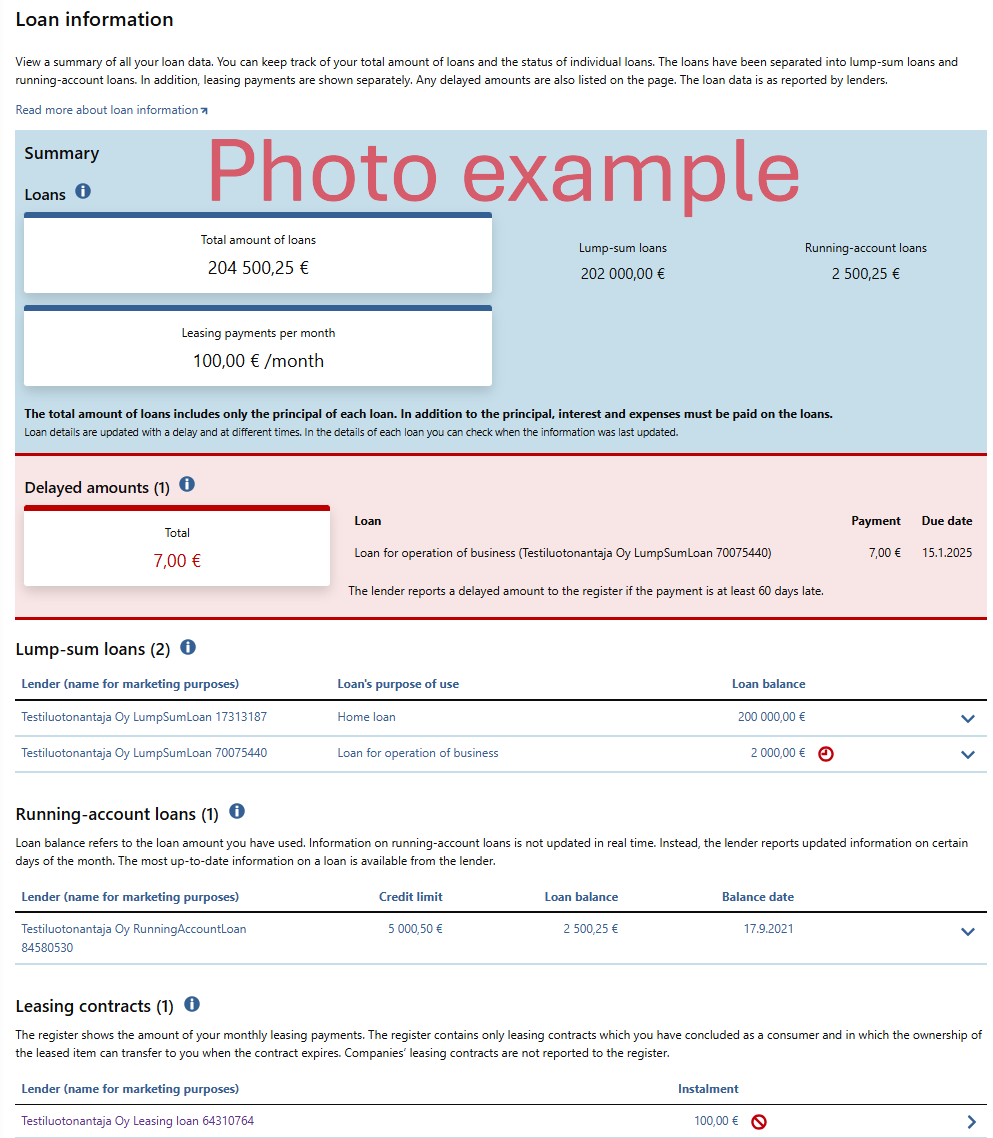 Loan information includes information on such loans granted to you that lenders have reported to the register. Lenders report only such loan information to the register that must be reported under the Act on the Positive Credit Register.