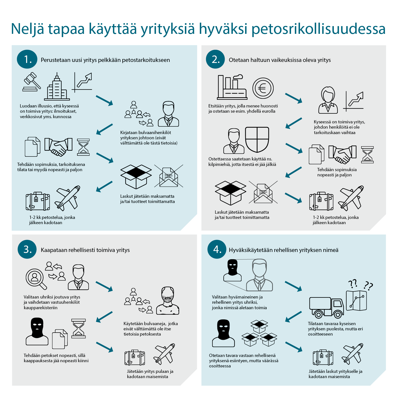 Yritysten ammattimainen hyväksikäyttö petosrikollisuudessa on ollut viime vuosina selvässä kasvussa ja aiheuttaa laaja-alaisesti vahinkoja sekä yrityksille että yhteiskunnalle. Ilmiön euromääräistä laajuutta ei ole mitattu eikä siitä ole saatavilla tilastotietoa.