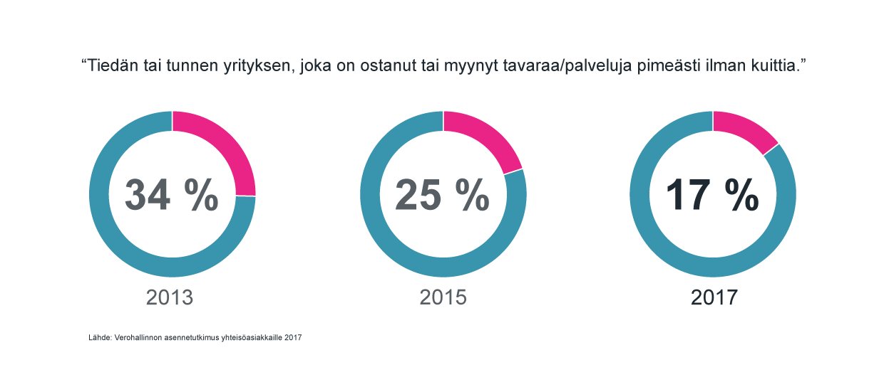 Mielenkiintoinen yksityiskohta tuloksissa oli se, että niiden asiakkaiden määrä, jotka vastasivat ”Tiedän tai tunnen yrityksen, joka on ostanut tai myynyt tavaraa tai palveluja pimeästi ilman kuitteja” on neljässä vuodessa puolittunut. Vielä vuonna 2015 kolmasosa vastaajista tiesi tai tunsi yrityksen, joka on ostanut tai myynyt tavaraa tai palveluja pimeästi ilman kuittia. Tällä kertaa 17 prosenttia vastaajista sanoi näin.