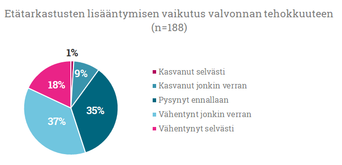 Peräti 55 prosenttia kyselyyn vastanneista viranomaisista koki etätarkastusten lisääntymisen heikentäneen valvonnan tehokkuutta. Tulevaisuutta luodattiin kysymyksellä, jossa pyydettiin ennakoimaan viruksen aiheuttamaa työkuormaa seuraavien yhden - kolmen vuoden aikana. Työmäärän kasvua ennakoi yhtä lailla 55 prosenttia vastaajista, samalla kun työmäärän vähenemistä arvio tapahtuvan vain neljä prosenttia vastaajista.