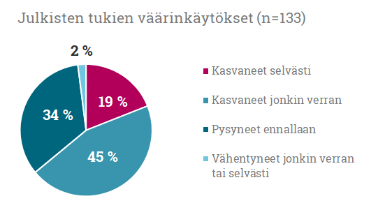 Vahvimmin esille nousivat julkisten tukien väärinkäyttöä koskevat huolet. Peräti 64 prosenttia vastanneista oli sitä mieltä, että väärinkäytökset ovat kasvaneet jonkin verran tai selvästi. Vastaajista 36 prosenttia oli sitä mieltä, että väärinkäytösten määrä on pysynyt ennallaan tai laskenut.