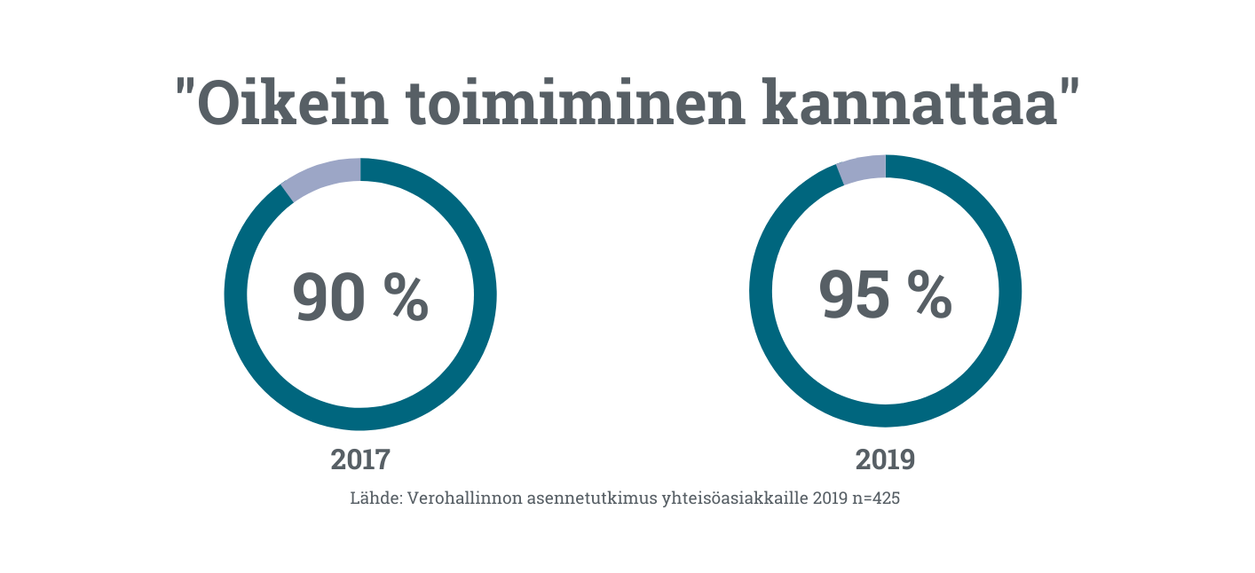 Aiempien vuosien tapaan verotuksen strategisista väitteistä eniten tukea yhteisöasiakkailta sai väite "Oikein toimiminen kannattaa", kun samaa mieltä väitteen kanssa olevien osuus nousi peräti 95 prosenttiin. Toisaalta ainoastaan 40 prosenttia oli samaa mieltä siitä, että rehellisesti toimivia yrityksiä suojellaan.