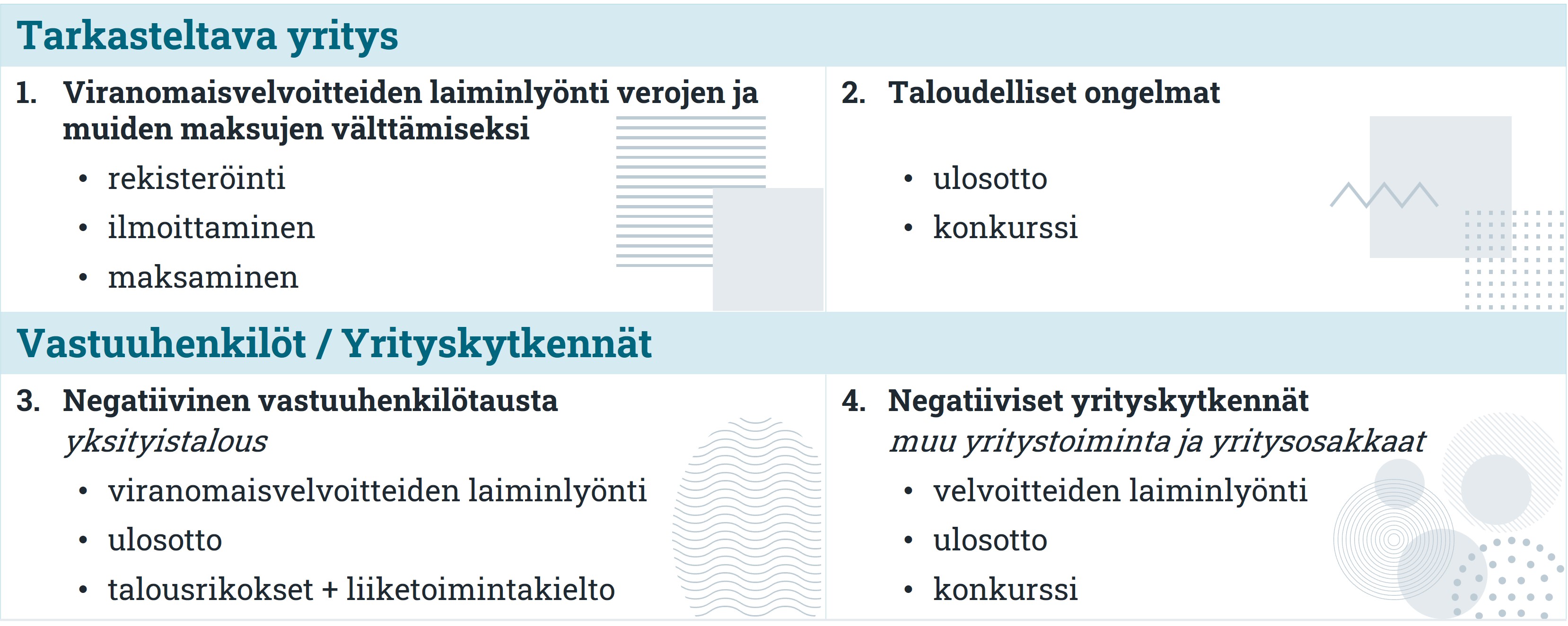 Luotettavuuden arviointi perustuu siihen, miten yritys on aiemmin suoriutunut veroihin ja muihin maksuihin liittyvistä velvoitteistaan. Arvioinnissa otetaan huomioon myös yrityksen maksukyky - yritys ei saa olla ulosotossa eikä konkurssissa.