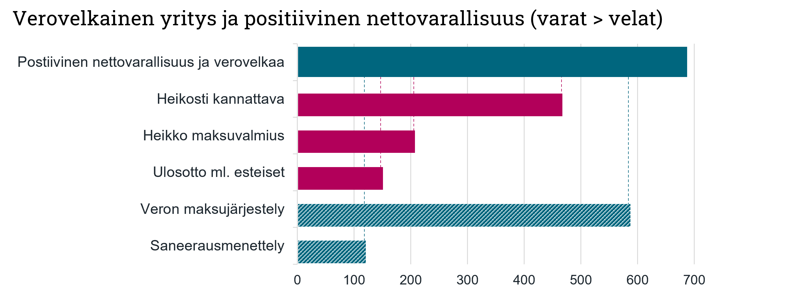 Konkurssiyhtiöiden verovelka suhteessa liikevaihtoon kasvoi merkittävästi ennen konkurssia. Vuotta ennen konkurssia noin puolella yhtiöistä verovelka ylitti viisi prosenttia liikevaihdosta, ja konkurssivuonna tämä raja ylittyi valtaosalla. Vertailuyhtiöissä vastaava osuus oli huomattavasti pienempi. Verovelkojen kasautuminen ja maksujärjestelyt olivat usein yhteydessä Verohallinnon konkurssihakemuksiin. Kolme neljästä konkurssista raukesi varojen puutteeseen.