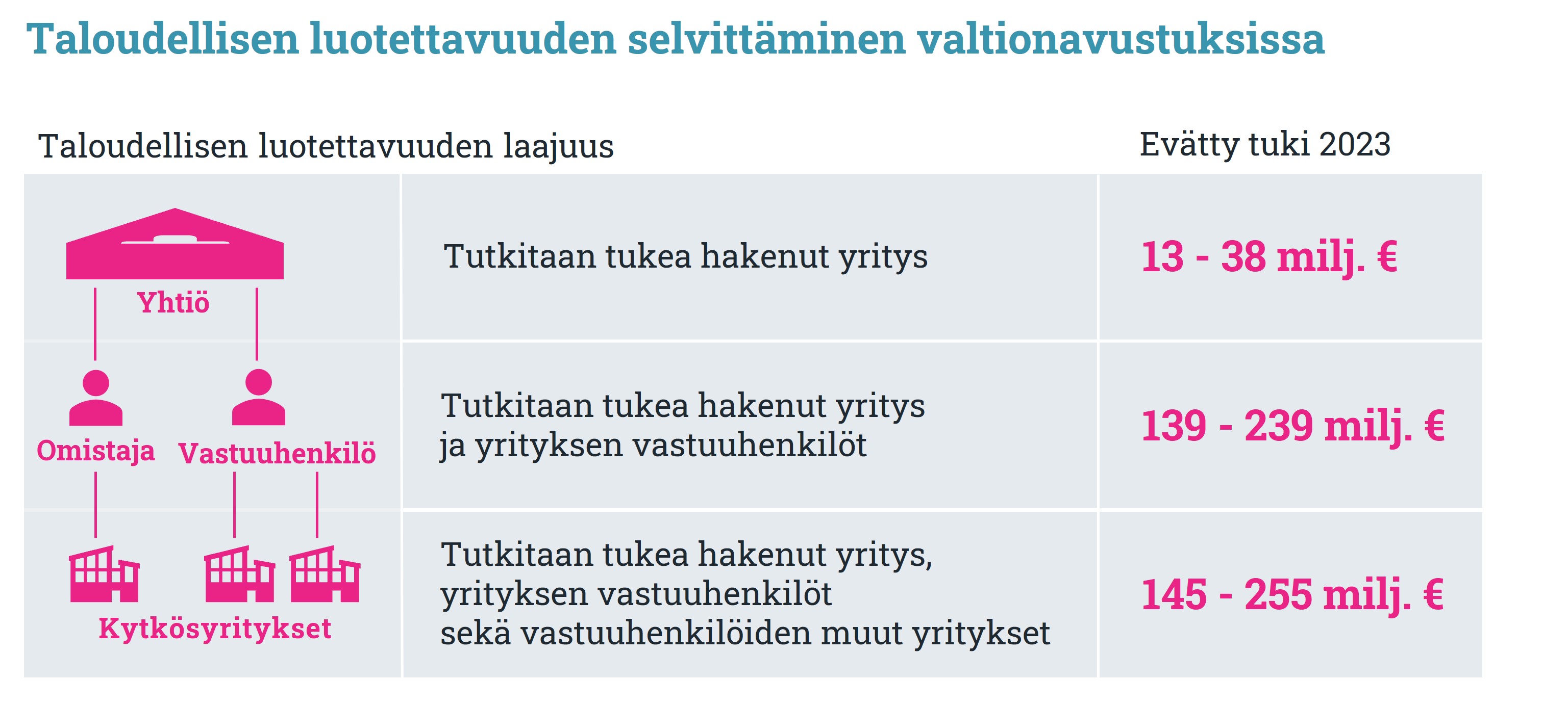 Jos yhdistyksen tai säätiön vastuuhenkilöiden taloudellinen luotettavuus olisi ollut rahankeräysluvan saamisen vaatimuksena maaliskuussa 2025, olisi rahankeräyslupa voitu evätä noin 200 keräysluvallisista yhdistyksistä ja säätiöistä, mikä on noin 15 prosenttia kaikista myönnetyistä rahankeräysluvista. Jos yhdistysten ja säätiöiden vastuuhenkilöiden taloudellinen luotettavuus olisi ollut vuonna 2023 valtionavustuksen saamisen edellytyksenä, olisivat vaatimukset voineet vaikuttaa lähes 400 yhdistyksen ja säätiön toimintaan. Näille yhteisöille maksettiin vuonna 2023 elinkeinotukia tai niihin verrattavia avustuksia lähes 30 miljoonaa euroa. Harmaan talouden selvitysyksikön julkaisemassa katsauksessa luotettavuuden arvioinnissa käytettiin henkilöiden arvioverotus-, verovelka-, ulosotto- ja konkurssi- sekä liiketoimintakieltotietoja.