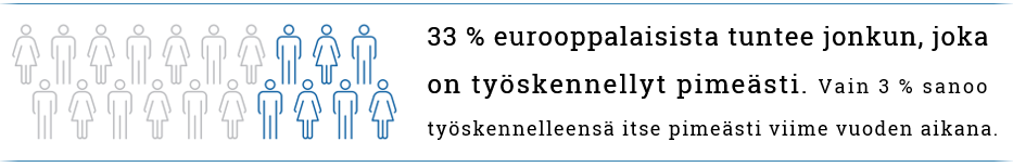 Tuoreen Eurobarometrin tulokset kertovat pimeän työn ilmenemisestä Euroopan unionin maissa. Kyselyyn vastanneista suomalaisista noin joka neljäs kertoo tuntevansa henkilökohtaisesti jonkun, joka työskentelee ilmoittamatta tulojaan viranomaisille.