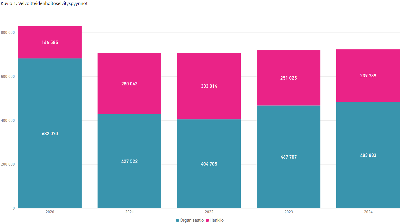 Velvoitteidenhoitoselvitysraportin tiedot kuvaavat organisaation tai organisaatiohenkilön lakisääteisten velvoitteiden hoitamista. Raportti sisältää toimintaa, taloutta sekä veroihin ja lakisääteisiin eläke-, tapaturma- ja työttömyysvakuutusmaksuihin ja Tullin kantamiin maksuihin liittyvien velvoitteiden hoitamista koskevia tietoja.