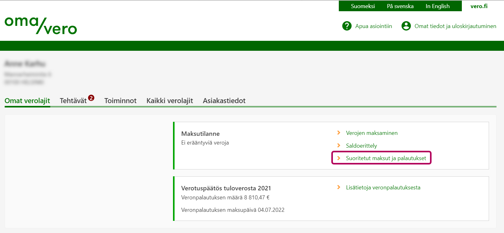 Valitse kohdasta Maksutilanne linkki Suoritetut maksut ja palautukset.