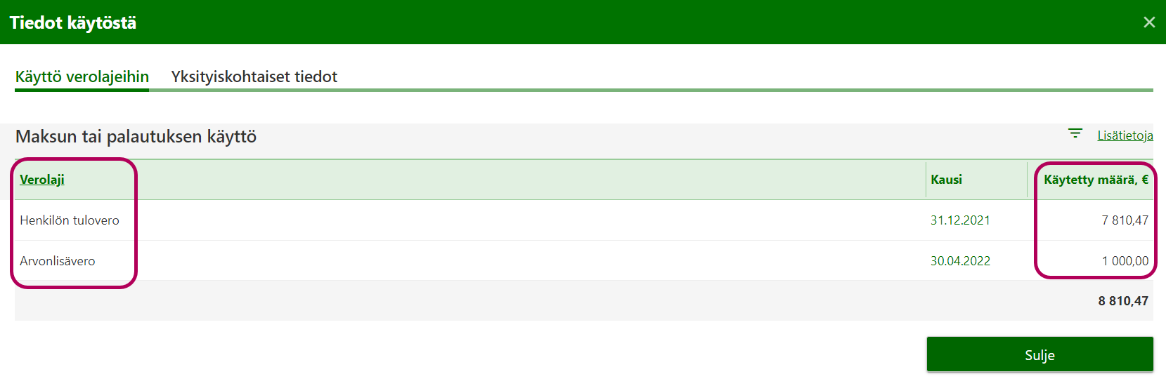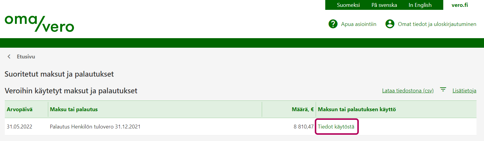 Jos veronpalautustasi on käytetty verojen maksuksi, näet tiedot käytöstä näin: Valitse taulukon "Veroihin käytetyt maksut ja palautukset" sarakkeesta Maksun tai palautuksen käyttö linkki Tiedot käytöstä.