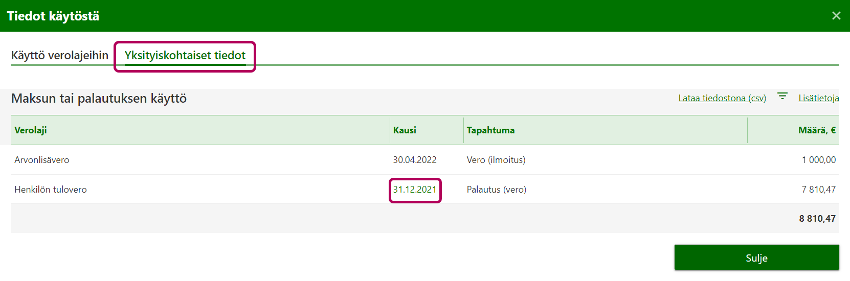 Sarakkeesta Määrä näet palautuksen määrän, joka on käytetty verojen maksuksi.