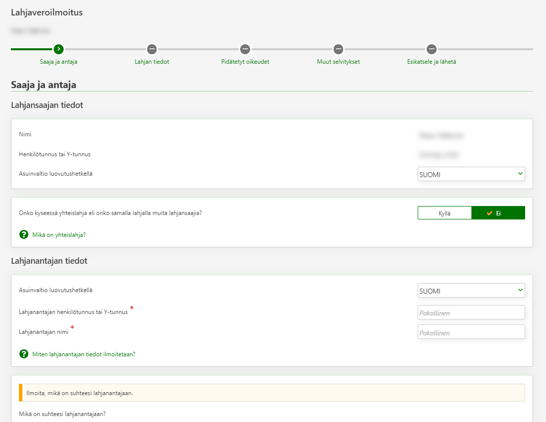 - Ilmoita myös lahjanantajan asuinvaltio, Y-tunnus tai henkilötunnus sekä nimi.