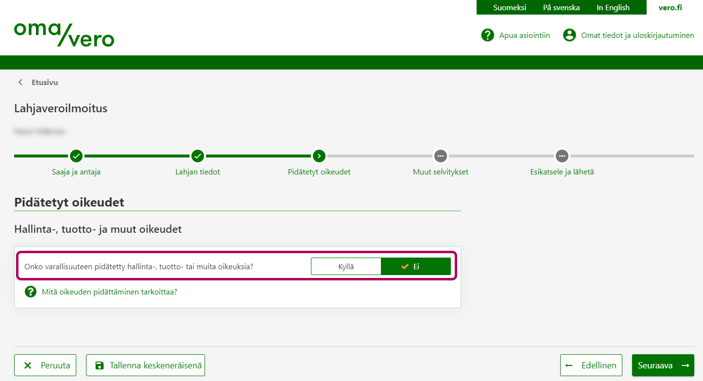 Valitse Kyllä, jos esimerkiksi varallisuuden hallintaoikeus säilyy lahjanantajalla eikä siirry sinulle. Ilmoita pyydetyt tiedot pidätetyistä oikeuksista.