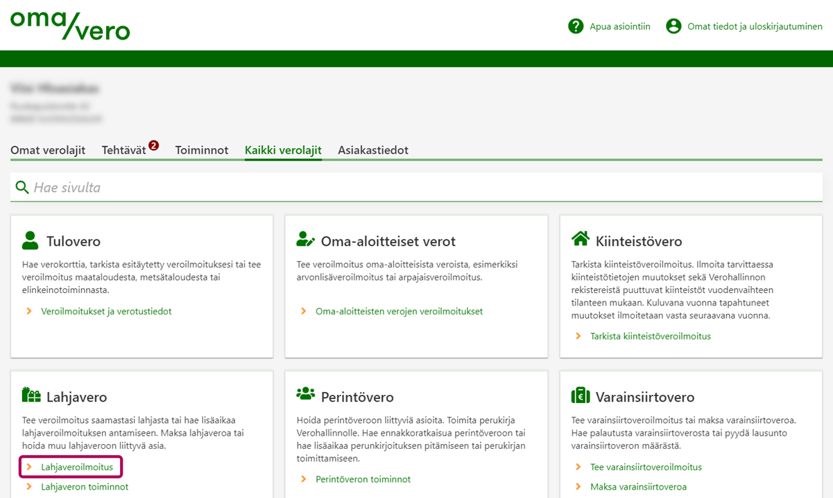 Valitse kohdasta Lahjavero linkki Lahjaveroilmoitus.