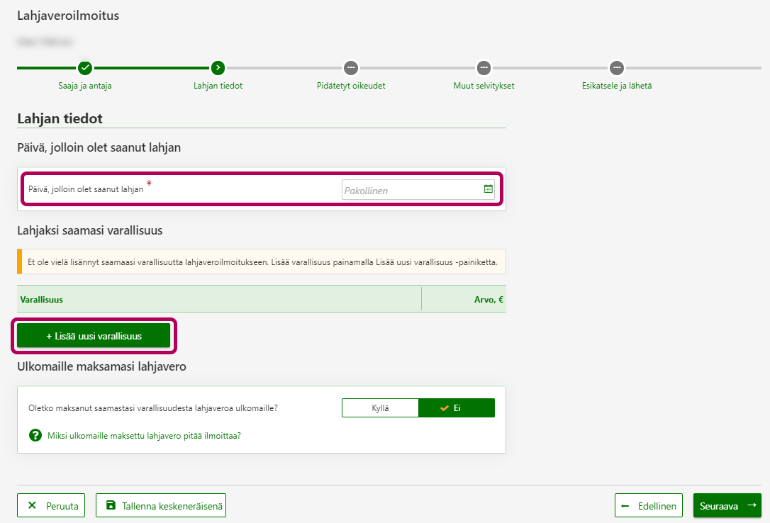 - Ilmoita myös lahjanantajan asuinvaltio, Y-tunnus tai henkilötunnus sekä nimi.