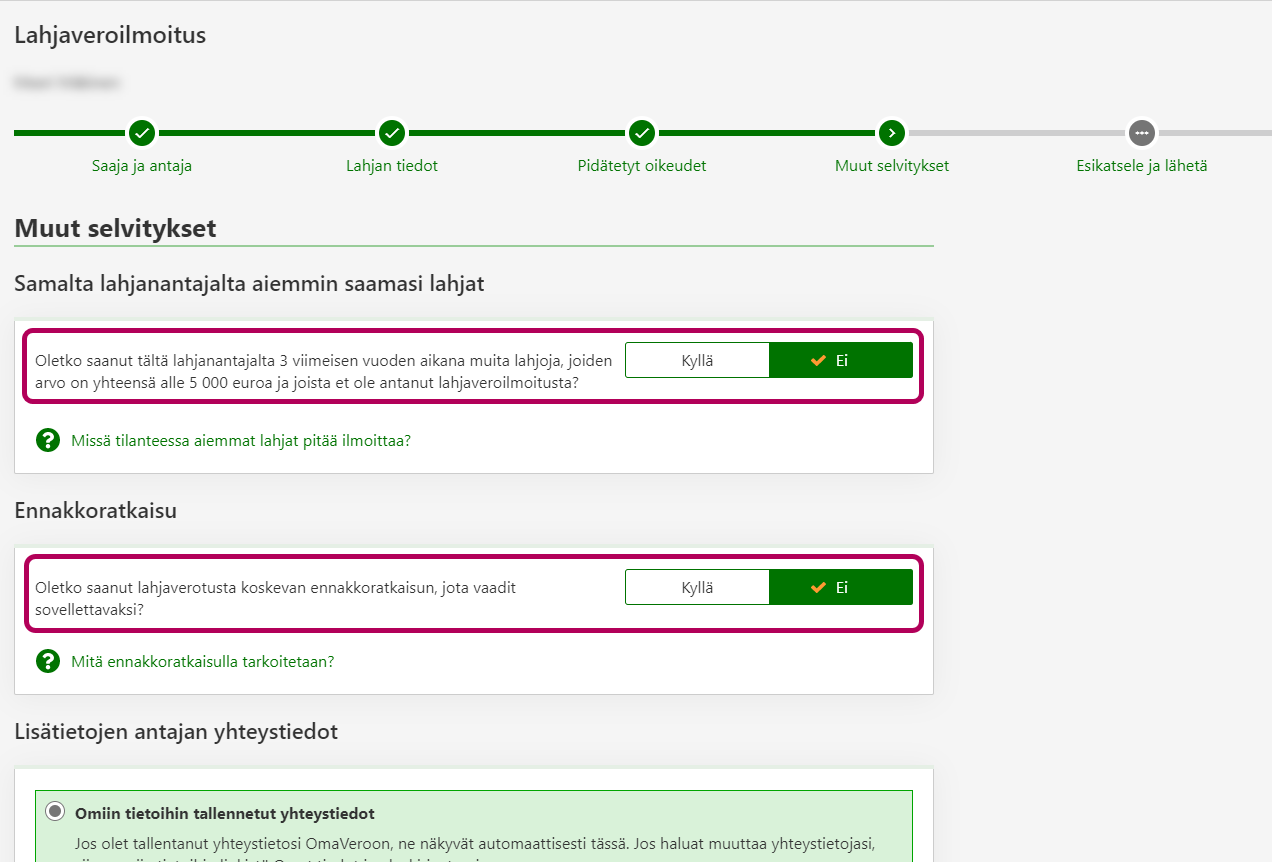 - Ilmoita myös, jos vaadit, että lahjaverotuksessa sovelletaan sinun tai lahjanantajan saamaa ennakkoratkaisua.