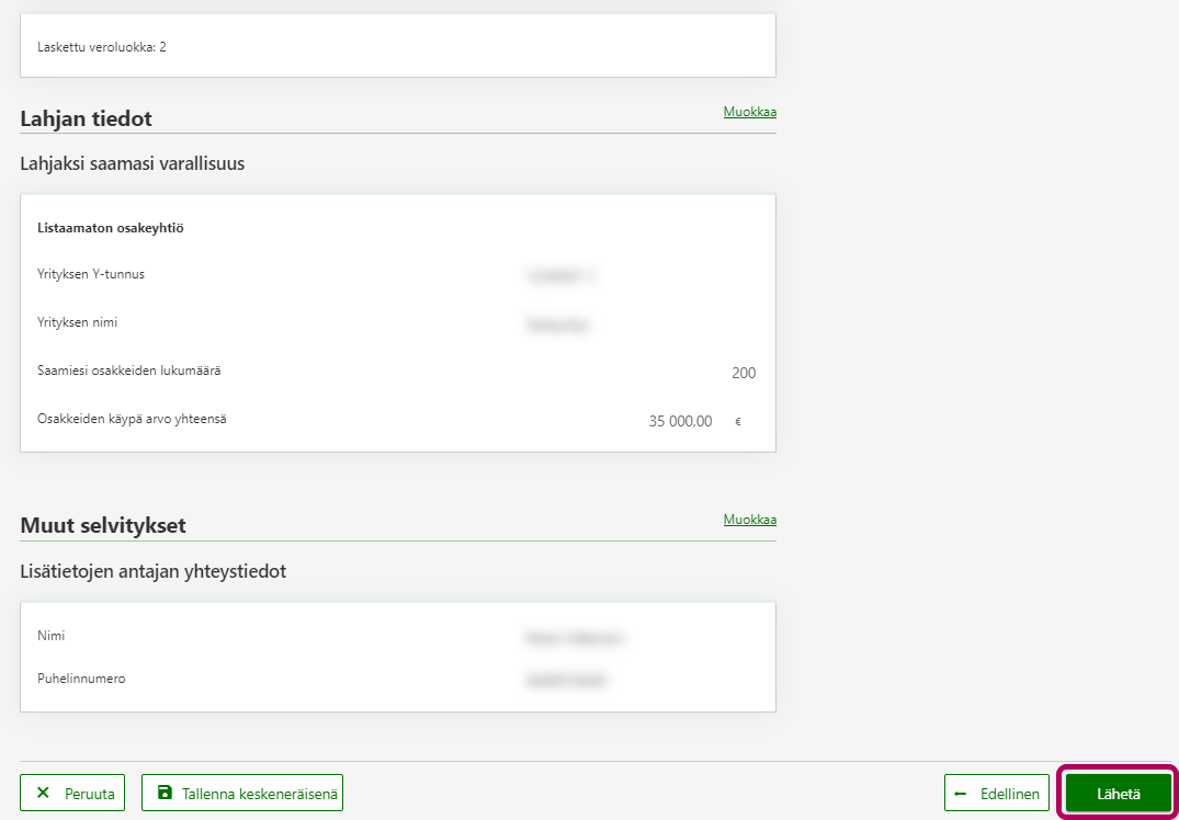 Vaihe Esikatsele ja lähetä: Tarkista, että tiedot ovat oikein. Valitse lopuksi painike Lähetä.