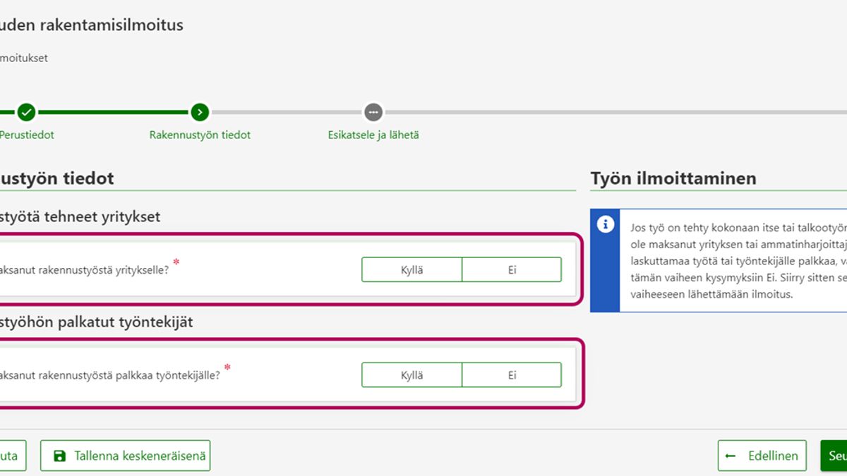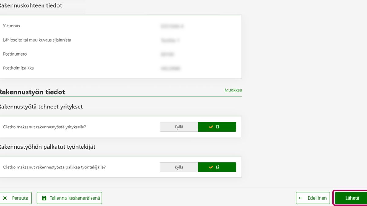 - Jos työ on tehty kokonaan itse tai talkoilla eli et ole maksanut työstä, vastaa tämän vaiheen kysymyksiin Ei.