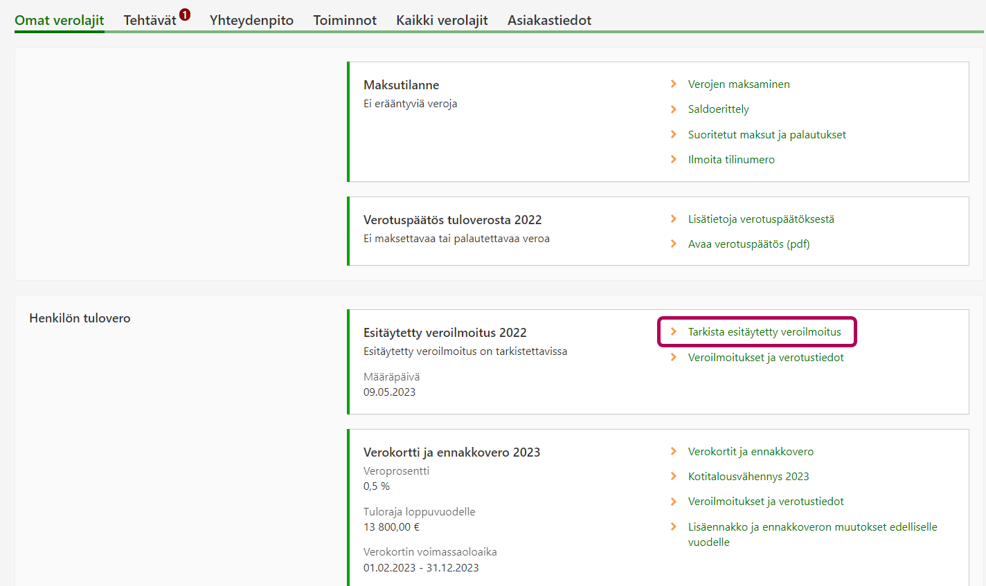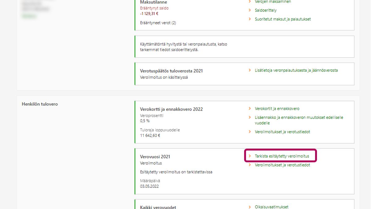 Valitse osion Henkilön tulovero kohdasta Esitäytetty veroilmoitus 2024 linkki Tarkista esitäytetty veroilmoitus.