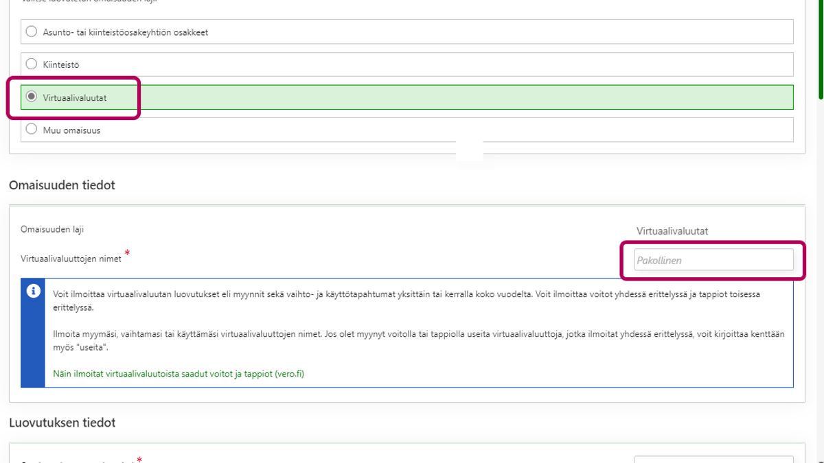 Käy läpi hakemuksen vaiheet ja ilmoita myynnit vaiheessa Muut tulot – Luovutusvoitot tai -tappiot. Valitse omaisuuden lajiksi Kryptovarat ja ilmoita kryptovarojen nimet.