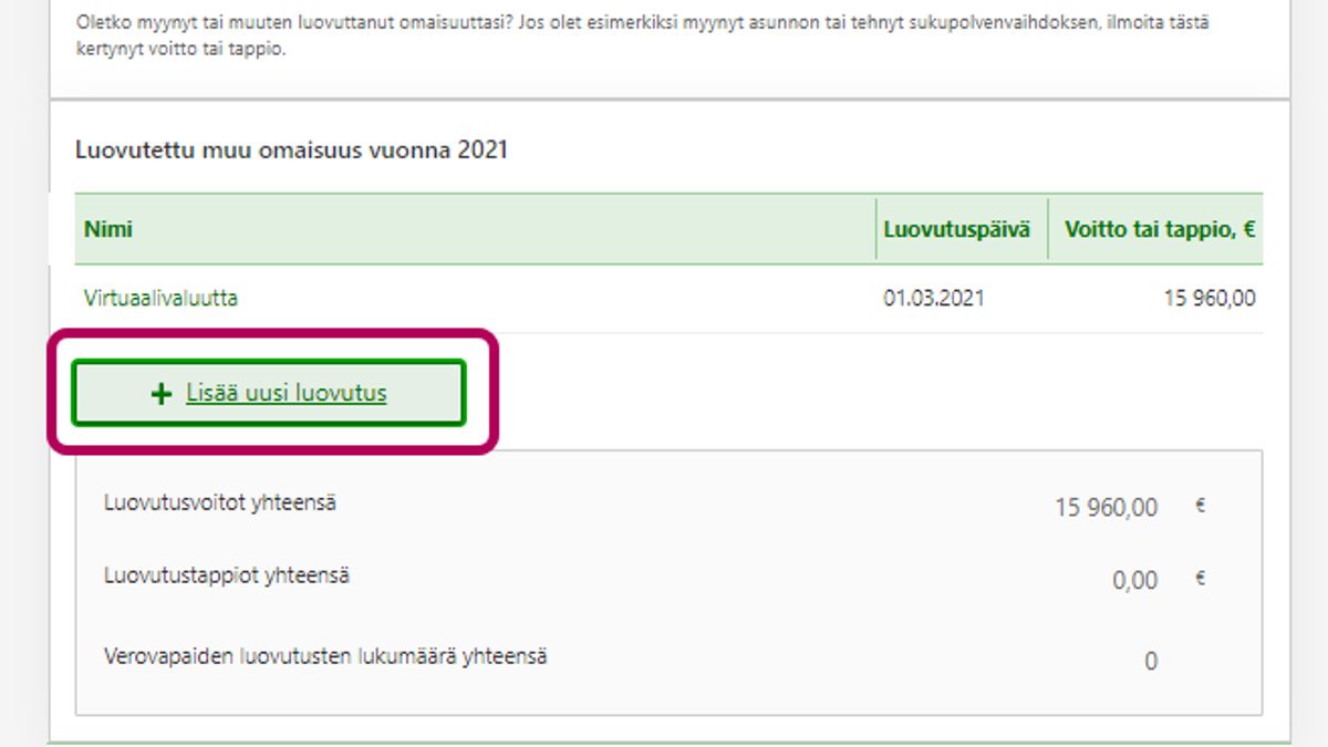 Valitse Kyllä kohdassa Luovutusvoitot. Valitse sen jälkeen Lisää uusi luovutus.