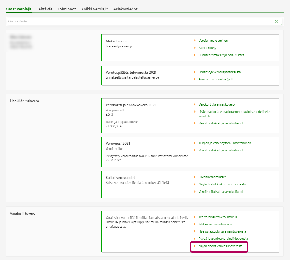 Jos olet antanut jo aiemmin varainsiirtoveroilmoituksen, korjaa antamaasi ilmoitusta ja lisää tieto viivästyskorotuksesta. Kun korjaat ilmoitusta, siirry OmaVeron etusivulla osioon Varainsiirtovero ja valitse linkki Näytä tiedot varainsiirtoverosta.