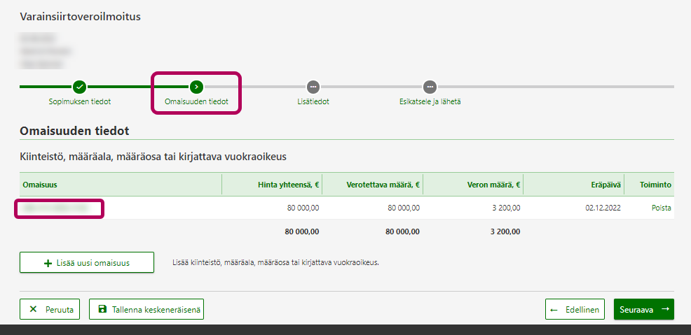Ilmoita viivästyskorotus varainsiirtoveroilmoituksen vaiheessa Omaisuuden tiedot.