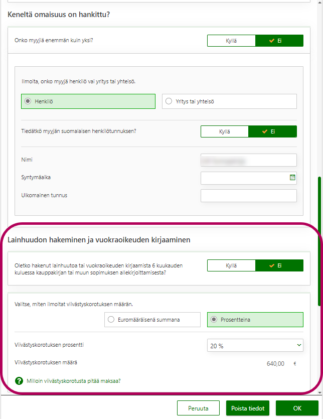 Vieritä sivua kohtaan Lainhuudon hakeminen ja vuokraoikeuden kirjaaminen. Vastaa ”Ei” kysymykseen Oletko hakenut lainhuutoa tai vuokraoikeuden kirjaamista 6 kuukauden kuluessa kauppakirjan tai muun sopimuksen allekirjoittamisesta.
