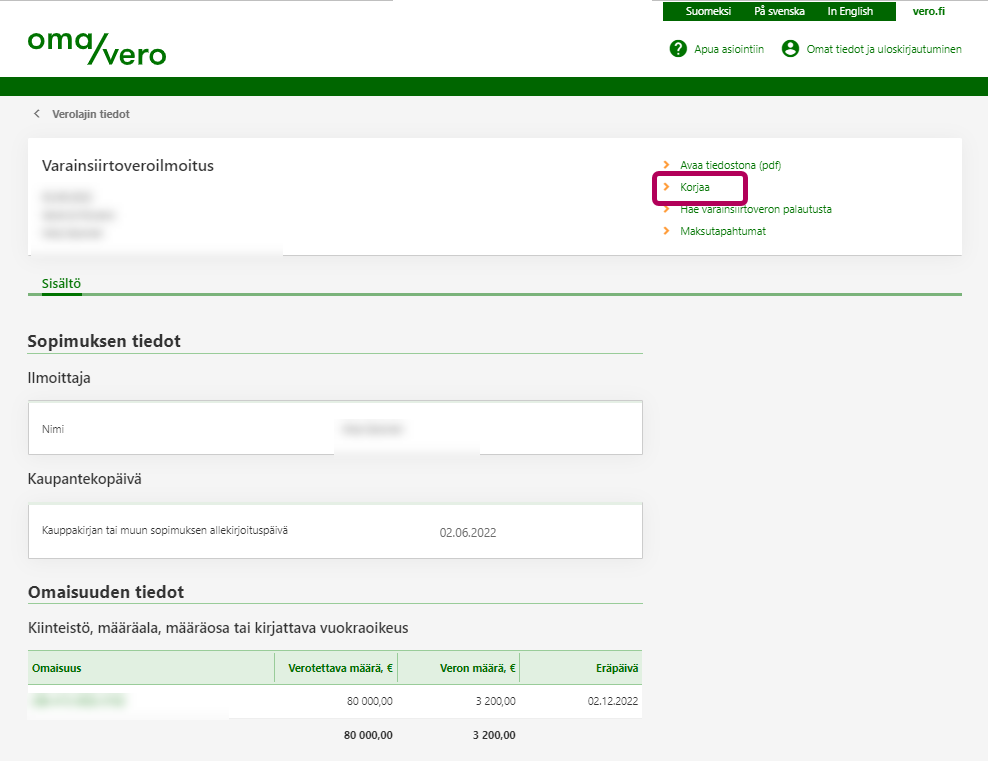 Jos olet antanut jo aiemmin varainsiirtoveroilmoituksen, korjaa antamaasi ilmoitusta ja lisää tieto viivästyskorotuksesta. Kun korjaat ilmoitusta, siirry OmaVeron etusivulla osioon Varainsiirtovero ja valitse linkki Näytä tiedot varainsiirtoverosta.