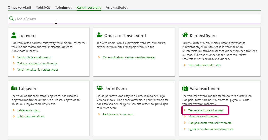 Valitse kohdasta Varainsiirtovero linkki Tee varainsiirtoveroilmoitus.