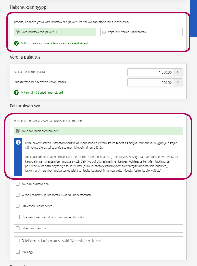 Ilmoita kohdassa Hakemuksen tyyppi, hakeeko yhtiö varainsiirtoveron palautusta vai vapautusta varainsiirtoverosta. Kerro palautuksen tai vapautuksen syy. Tarkista myös, mitä liitteitä hakemukseen tarvitaan.