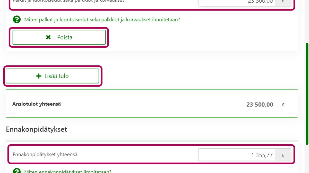 - Valitse linkki Lisää tulo. Ilmoita tiedot tuloista ja niistä tehdyistä ennakonpidätyksistä.