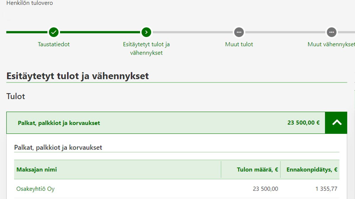 Maksaja ilmoittaa tiedot maksamistaan palkoista tulorekisteriin. Verohallinto saa tiedot tulorekisteristä, ja ne näkyvät veroilmoituksessasi.