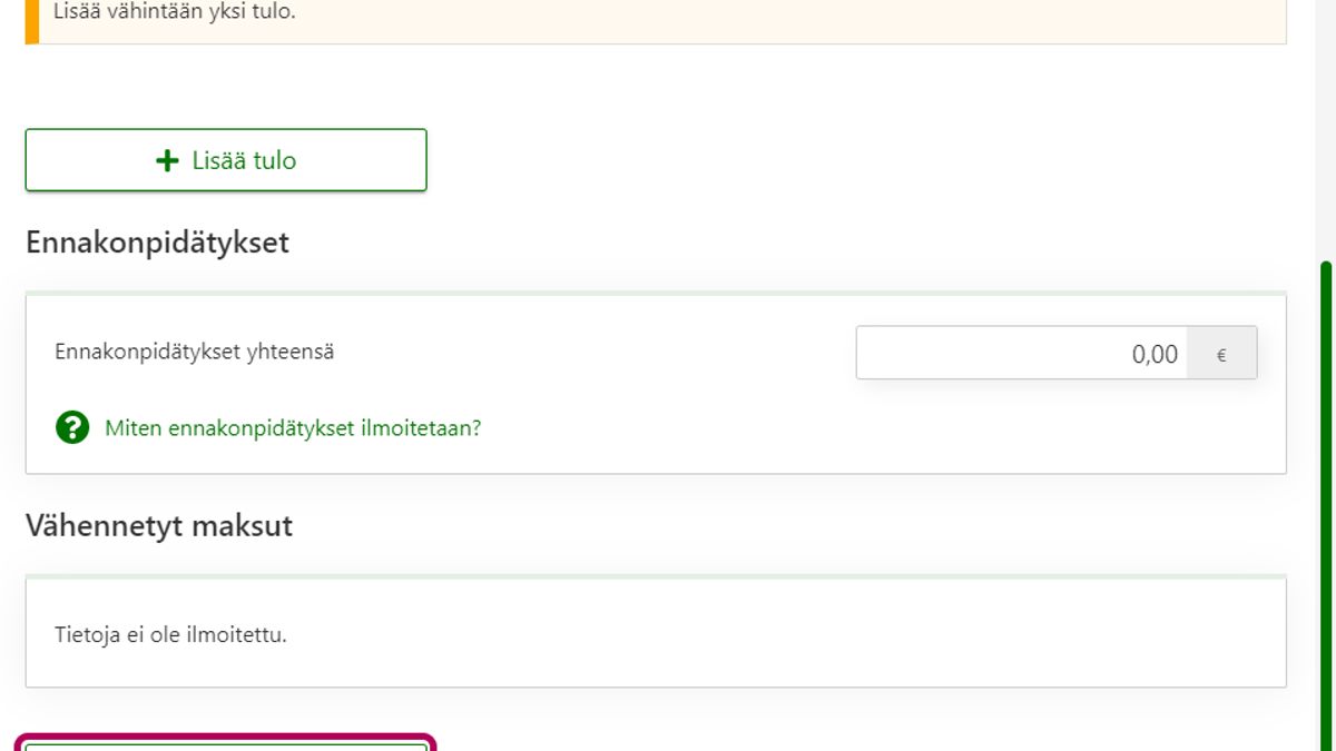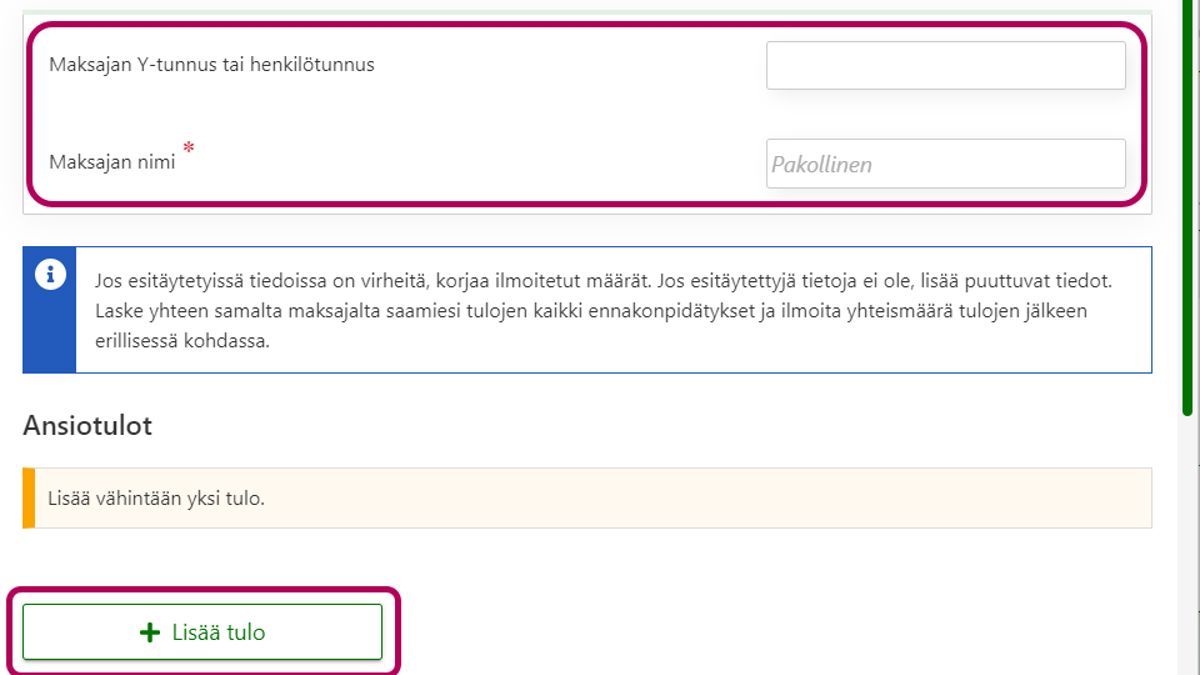 - Jos lisäät samalta maksajalta kokonaan uuden tulon, valitse painike Lisää tulo. Ilmoita tiedot tuloista ja niistä tehdyistä ennakonpidätyksistä.