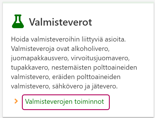 Valitse osiosta Valmisteverot linkki Valmisteverojen toiminnot.
