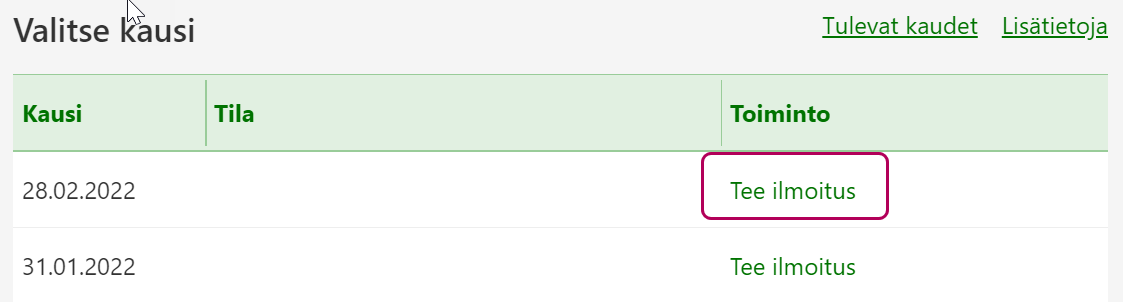 Valitse verokausi, josta haluat tehdä ilmoituksen ja avaa linkki Tee ilmoitus.