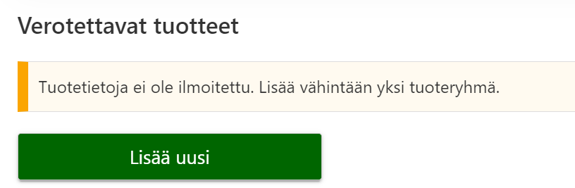 Lisää tarvittaessa uusi tuoteryhmä valitsemalla painike Lisää uusi. Anna avautuvaan ikkunaan verotettavien tuotteiden tiedot ja valitse painike OK.