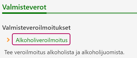 Valitse kohdasta Valmisteveroilmoitukset linkki Alkoholiveroilmoitus.
