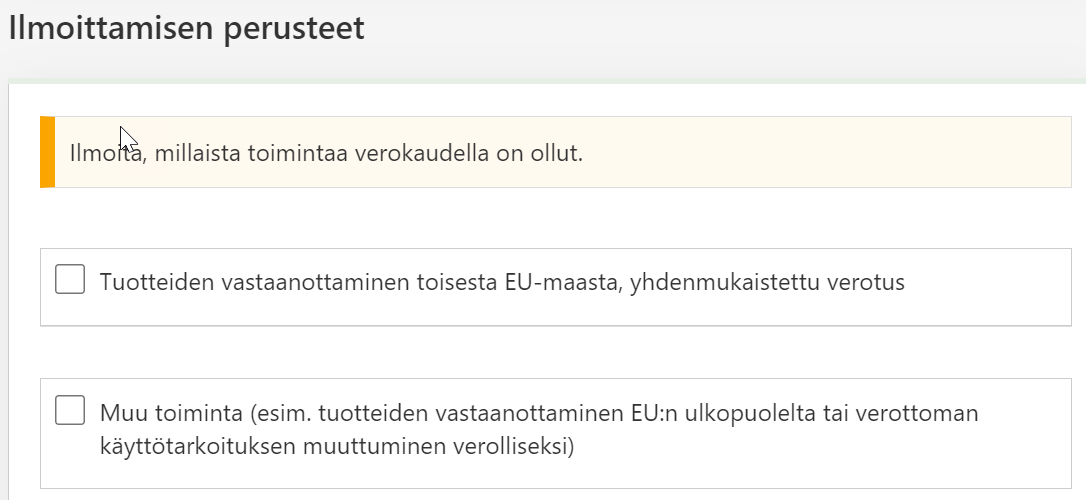 - Ilmoita kohdassa Ilmoittamisen perusteet, millaista toimintaa sinulla on ollut verokaudella. Voit ilmoittaa samalla ilmoituksella tietoja useammasta kuin yhdestä toiminnasta.